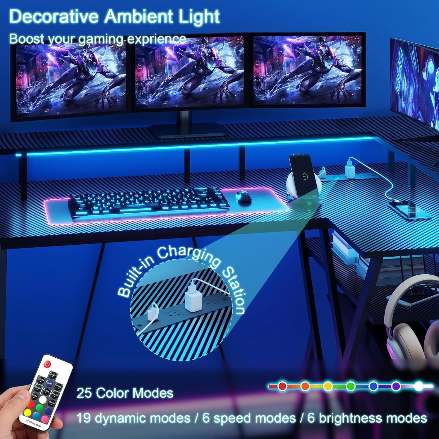 Discover the 47 Inch L Shaped Gaming Desk with LED Lights! Ultimate corner desk with 7-color LED, 3 outlets, 2 USB ports, and ergonomic wraparound design. Upgrade today!