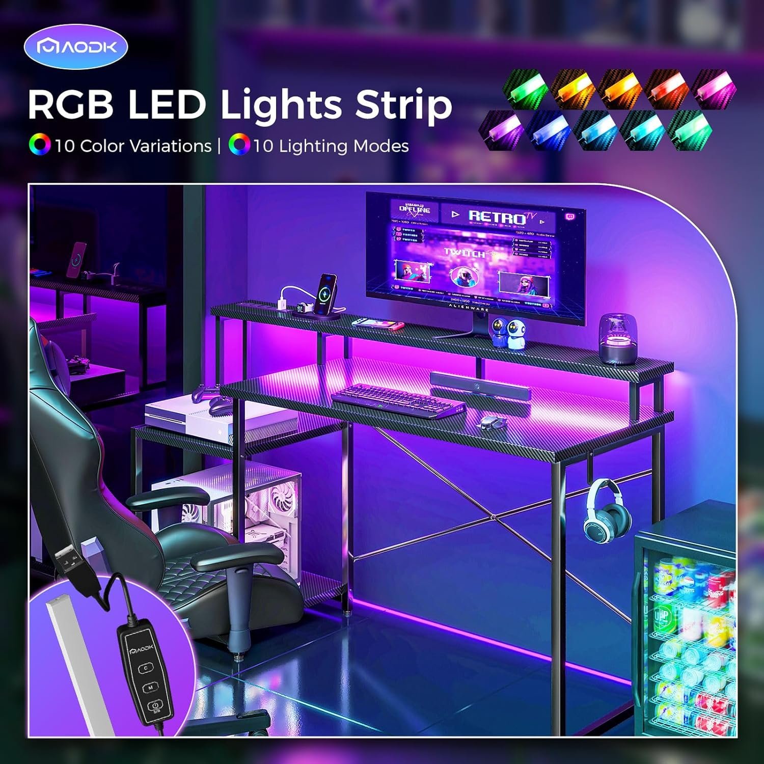 AODK Computer Desk, 56 Inch Gaming Desk with Led Lights & Power Outlet, Office Desk with Printer Storage Shelves, Reversible Desk with Monitor Shelf & Headphone Hook, Carbon Fiber Black