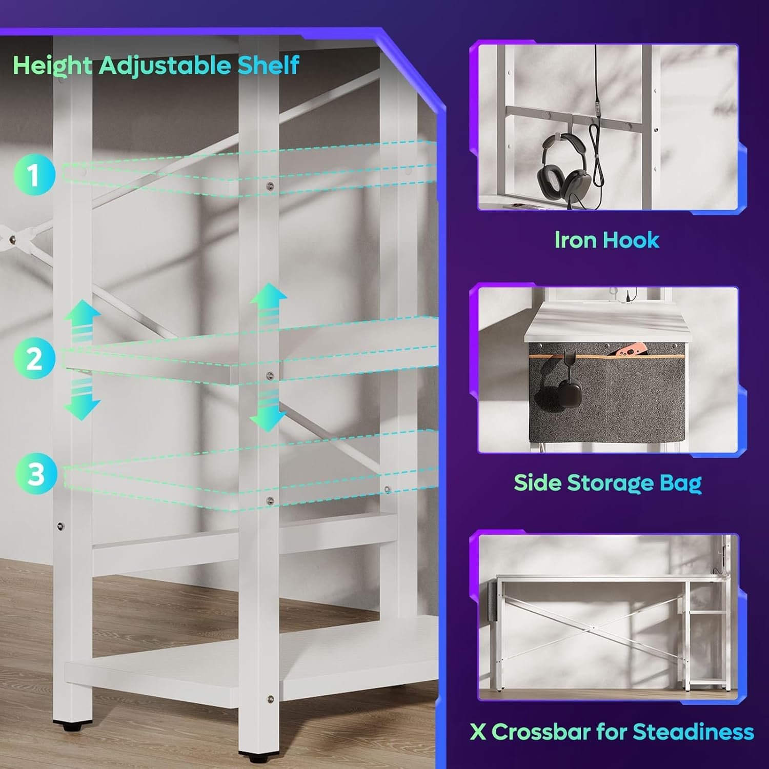 Here's a scenario: I've got my PS5 on one side, my custom-built PC on the other. The reversible shelves on this desk can be installed on the left or right, making it highly adaptable. The storage bag and headset hook are the cherries on top. My setup looks neater than my mom’s knitting corner, with places for every tiny cable and bobblehead figure I collect. Admittedly, the side storage bag is a lifesaver for stashing away my ever-increasing pile of snack wrappers.