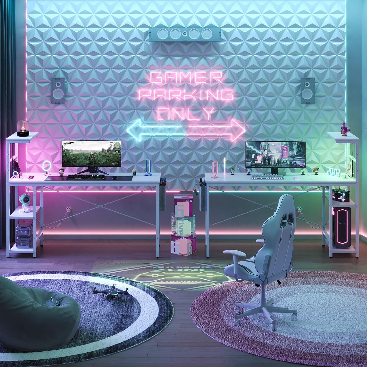 Bestier Gaming Desk with Power Outlets, 61 Inch Large Led Gamer Desk with 4 Tiers Reversible Shelves, PC Gaming Table with Headset Hook & Side Storage Bag for Bedroom (White 3D Carbon Fiber)