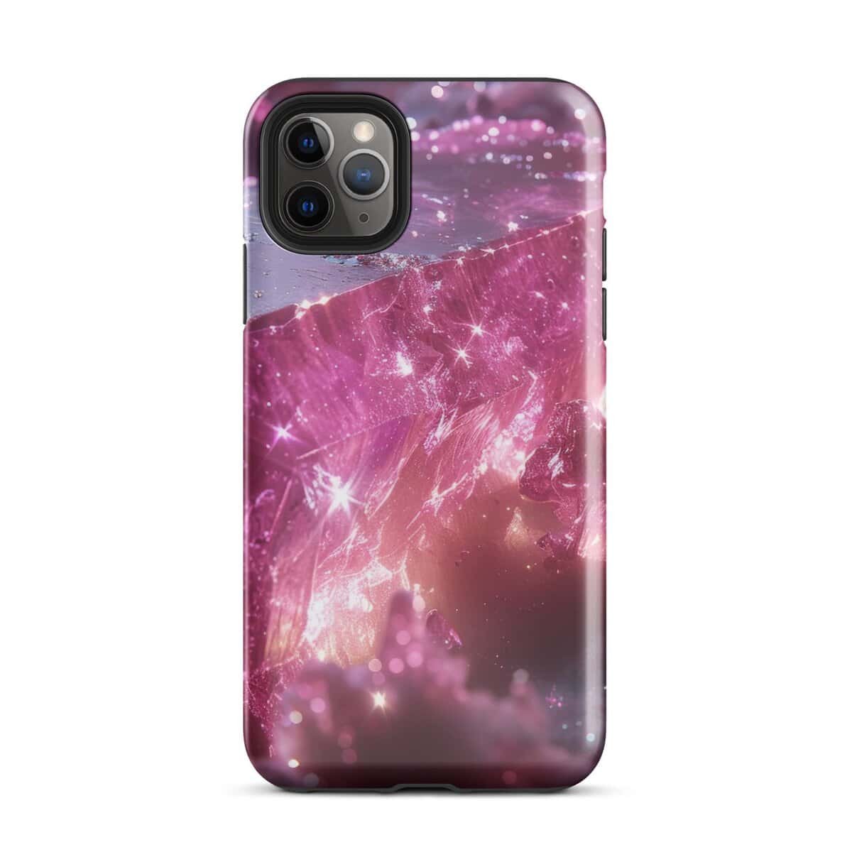 The case features a stunningly detailed image of what appears to be a crystalline gem, deep pink and richly hued, with an inner glow that hints at untold mysteries. It’s as if a fragment of the cosmos has been encapsulated within the gem, with twinkling stars and nebulous clouds embedded in its facets. The crystal is set against a backdrop that exudes a soft, cosmic glow, where darker pinks and light sparkle with an interstellar quality.