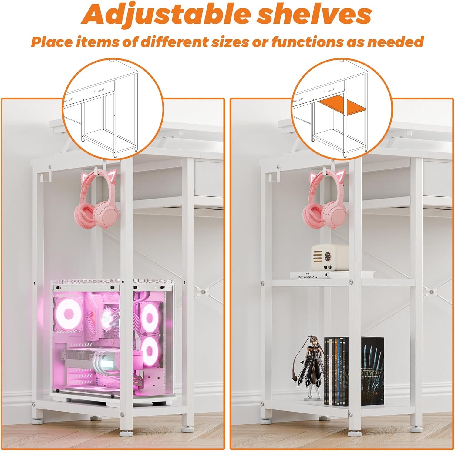 The shelves under the desk aren’t just for show—they're functional and thoughtfully designed. There’s room for your computer host on whichever side you fancy. The other side features two layered shelves for stacking games, controllers, or maybe even some of those books you keep meaning to read. Two side hooks keep your headphones and other essentials right within arm's length.