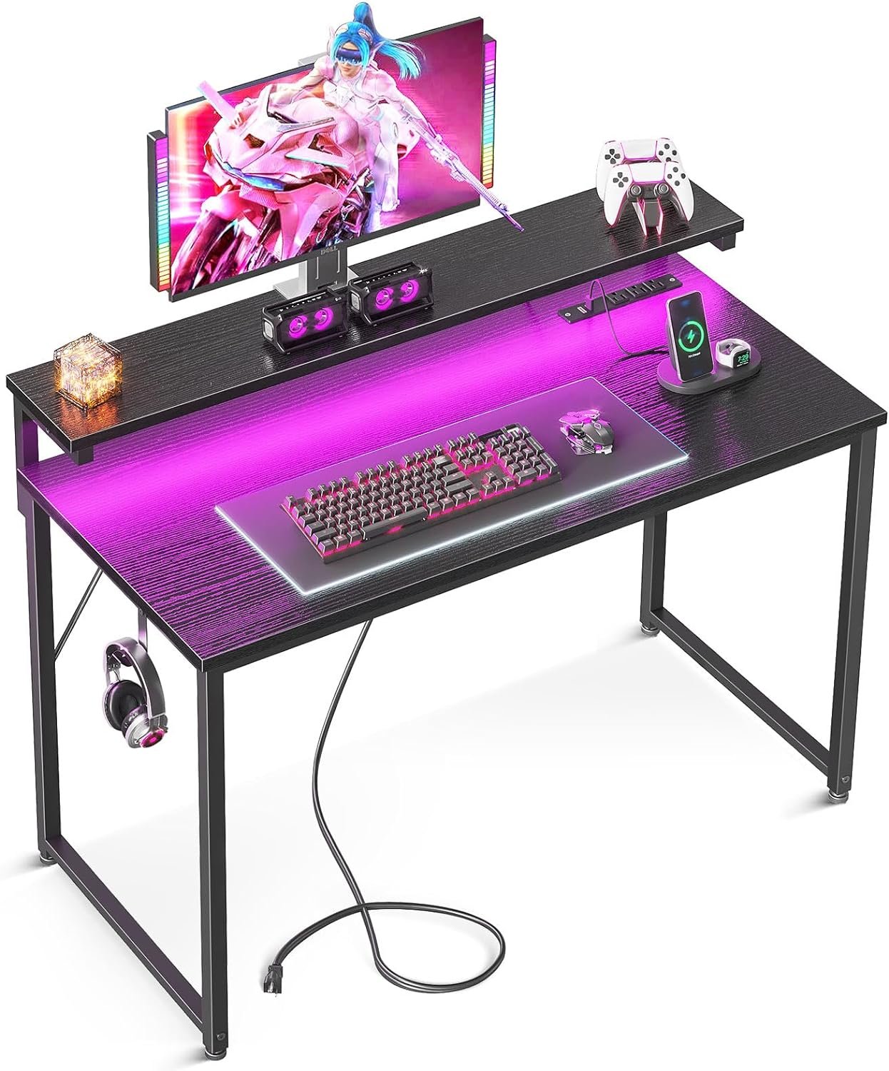 AODK Small Desk, 40 Inch Gaming Desk with LED Lights and Power Outlet, Computer Desk with Adjustable Monitor Shelf (3 Heights), Home Office Table Study Desk Compact Desk for Small Space, Black