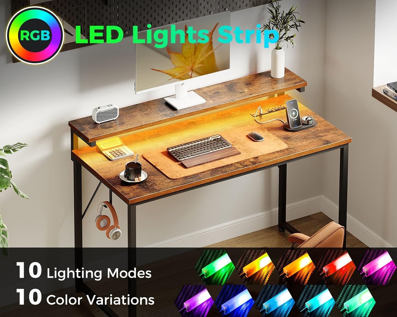 AODK Small Desk, 40 Inch Gaming Desk with LED Lights and Power Outlet