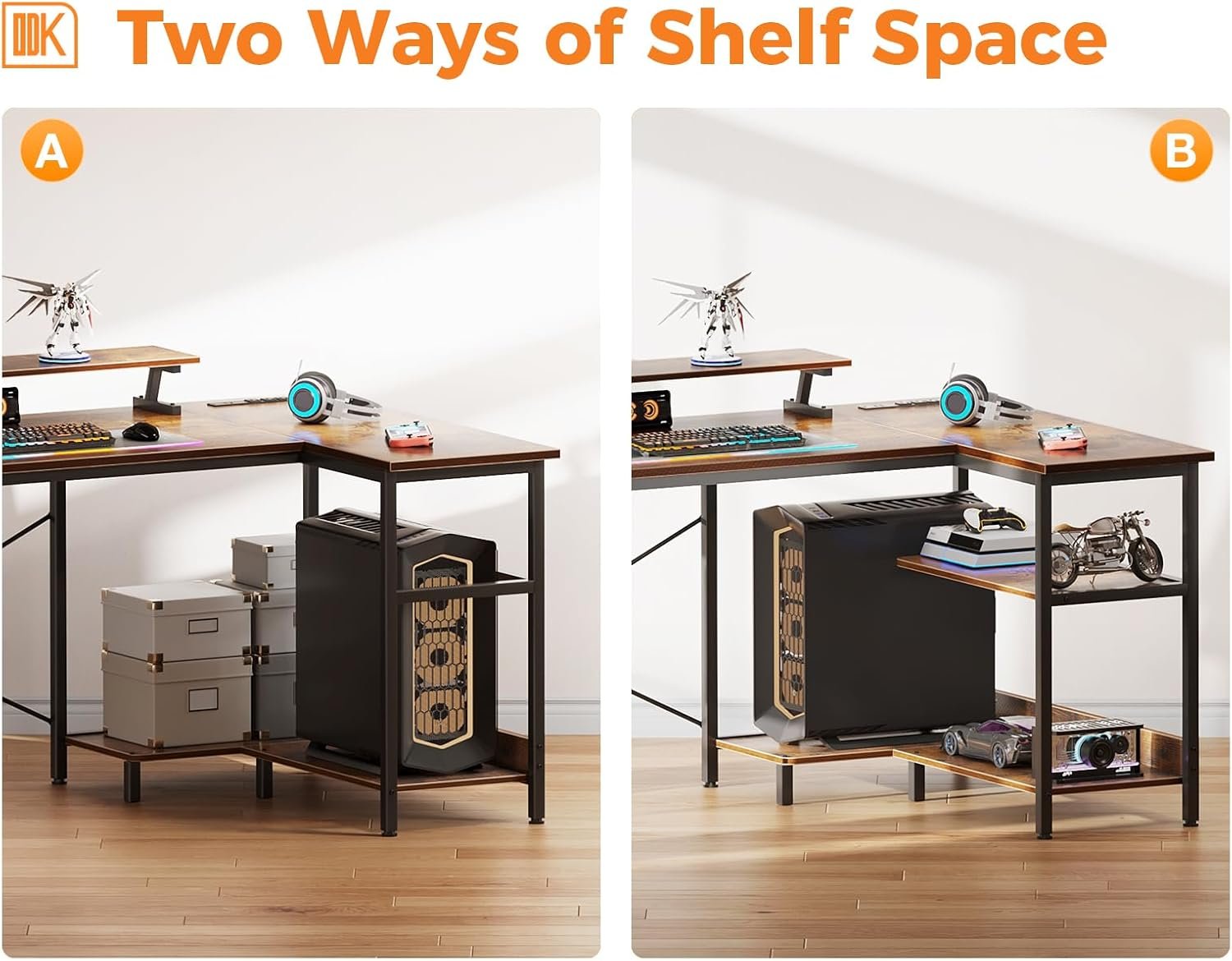 ODK 48 Inch Gaming Desk with USB Charging Ports and LED Lights, Reversible L Shaped Computer Desk with Storage Shelves & Monitor Stand, Corner Gamer Desk Table with Power Outlets, Black